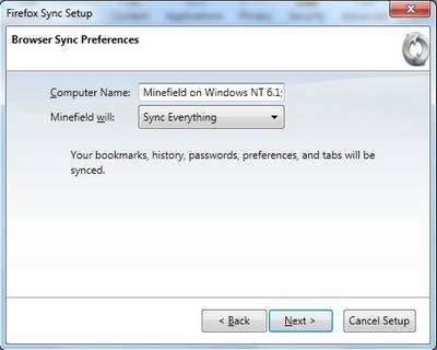 Để sử dụng tính năng này, bạn kích vào nút Menu trên Firefox (nút Minefield trên góc trái cửa sổ), chọn Options. Tại cửa sổ Options hiện ra, bạn chọn Sync , rồi nhấn Set Up Firefox Sync .